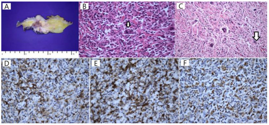 An infiltrative mass with mucosal irregularity was observed in the ileum on the gross examination of the excised ileal mass. The tumor involved mucosa to the serosa, and the cut surface was pale yellowish white, firm, and fibrotic with multifocal hemorrhage (A). Tumor cells in the background of the inflammatory cell infiltration had large oval nuclei with vesicular chromatin and prominent nucleoli. Some tumor cells show hemophagocytosis and emperipolesis ((B), H & E ×400, white arrow). Multinucleated giant tumor cells were also found ((C), H & E ×200, white arrow). Immunohistochemical staining (D–F) revealed positive CD4 ((D), ×400), CD45 ((E), ×400), and CD68 ((F), ×400). These findings were compatible with the diagnosis of histiocytic sarcoma (HS).
