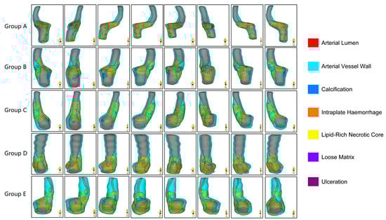 Multidimensional quantitative illustration of the intraplaque components of carotid plaques with different degrees of stenosis (n = 5). Demonstrating the morphological characteristics of the plaques and the distribution of the different components within the plaques from eight directions.