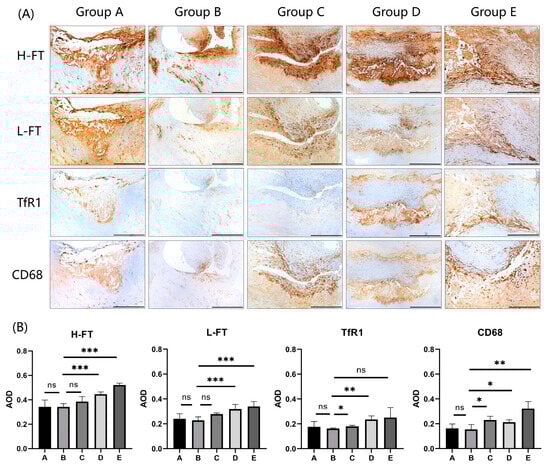 Expression analysis of H-FT, L-FT, and TfR1 in carotid plaques with different degrees of stenosis. (A) Immunohistochemical results showing that the iron metabolism proteins H-FT, L-FT, and TfR1, which are consistent with CD68 expression sites in carotid plaques, are mainly distributed in the carotid intima and carotid mesentery (n = 5). Positive staining was brownish yellow. Bar = 500 μm. (B) Graphs showing the results of immunohistochemical AOD value analysis of H-FT, L-FT, TfR1, and CD68 in carotid plaques in a total of 20 cases from 5 groups. * p < 0.05, ** p < 0.01, *** p < 0.001, ns indicates no significant differences.