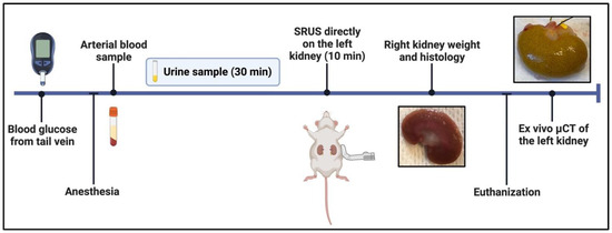 Overview of the experimental sequence. Before the rat was anesthetized, blood glucose from the tail vein was measured. After anesthesia, a blood sample via a catheter in the carotid artery as well as urine collection via a catheter in the ureter were acquired. The 10 min SRUS imaging was performed on the left kidney. Just before the animal was euthanized, the right kidney was excised for histology. Finally, the left kidney was perfused with CT contrast and excised to be scanned. Figure created with BioRender.com, accessed February 2023.