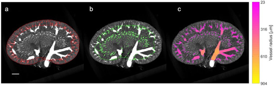 µCT processing and density analysis. The coronal slice of a µCT scan is portrayed from a 22-week-old lean Zucker rat with the following: (a) the cortex defined by red borders and the mask of small vessels included in the cortical vascular density; (b) the medulla defined by the green border and the mask of small vessels included in the density analysis for the medulla region (note the exclusion of the large segmental and arcuate vessels); and (c) colored voxels representing the full vessel segmentation and the subsequent vessel radius estimation. The color indicates the local vessel radius in accordance with the colormap to the right. Size bar: 2 mm.