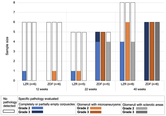 Histological evaluation of glomeruli. Qualitative grading of glomerulopathy in PAS-stained kidney tissue from the lean Zucker rats (LZRs) and the Zucker diabetic fatty rats (ZDF) by week 12, 22, and 40. Grade 2 is displayed in light colors with respect to the specific pathology evaluated and is defined as the specimens with moderate involvement. Grade 3 is displayed in dark colors and is defined as the number of specimens with severe involvement.
