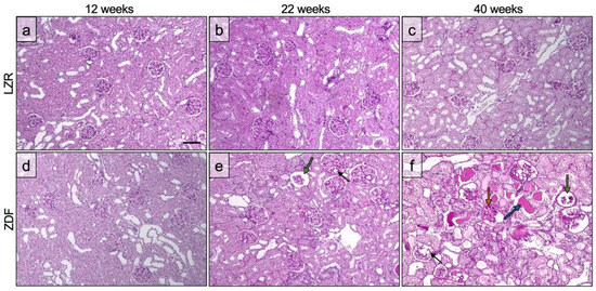 Figure 5 displays the qualitative grading of glomerulopathy with respect to the proportion of glomeruli affected by the specific pathology. As expected, the histological evaluation showed an increase in the affected glomeruli with age in the ZDF rats with regard to sclerosis, microaneurysms, and completely or partially empty glomeruli [28,29]. In the 12-week-old group, none of the rats had severe glomerulopathy. In the 22-week-old group, one ZDF rat had complete or partial glomerular atrophy in numerous glomeruli, and all of the 22-week-old ZDF rats had microaneurysms in numerous glomeruli. In the 40-week-old group, all of the ZDF rats had affected glomeruli to a severe degree with regard to glomerular atrophy, microaneurysms, and sclerotic areas. The pathological changes of the glomeruli are displayed in Figure 6, showing one field of view of the cortex from the PAS-stained kidney tissue. A more disordered pattern of the cortex was present in the ZDF rats at 40 weeks of age (Figure 6f), with microaneurysms, sclerosis, and either partial or complete glomerular atrophy in numerous glomeruli.