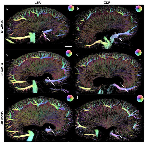 SRUS images of kidneys from the Zucker diabetic fatty (ZDF) rats and the lean Zucker rats (LZRs) by weeks 12, 22, and 40. (b,d,f) illustrate a less dense renal vasculature in the ZDF rats compared with their age-matched LZR (a,c,e). Hydronephrosis (arrows) was found in all the kidneys examined. The direction of the MBs, hence the blood flow’s direction, is illustrated by the color wheel in the upper right corner, e.g., green color represents tracked MBs moving downwards, in the renal vein it correlates with blood flow out of the kidney. Scale bar in (a): 2 mm.