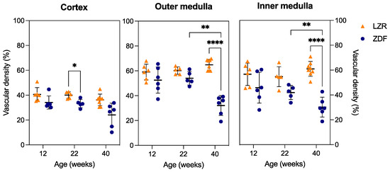 Vascular density measurements from the SRUS images. The vascular density is shown for the cortex, outer medulla, and inner medulla from the lean Zucker rats (LZRs) and the Zucker diabetic fatty rats (ZDF) by weeks 12, 22, and 40. A significant difference is indicated by p < 0.05, * 0.01–0.05, ** 0.001–0.01, and **** <0.0001. The lines indicate mean ± SD.