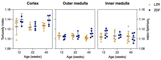 The estimated tortuosity in the SRUS images showed a non-significant trend to increase in the CO and OM of the 40-week-old ZDF rats. Another study found a significantly increased tortuosity in the cerebral microvasculature of aging mice when using the sum of angles metric, which is a different metric than the one used in our study (distance metric) [50]. Shelton et al. quantified the tortuosity on evolving tumors in mice using both metrics and presented an increase in the mean distance metric of ~14% and an increase in the mean sum of angles metric of ~60% compared to the control group [51]. Hence, the chosen metric used seems to be defining for the results obtained.