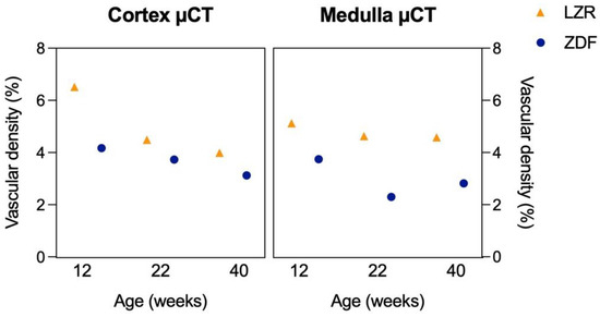 Vascular density measured with the µCT. This Figure shows the vascular density measured in the cortex and medulla of six rats: a lean Zucker rat (LZR) and a Zucker diabetic fatty (ZDF) rat from the 12, 22, and 40 weeks age groups.