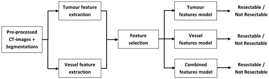 This retrospective single-center study consisted of four stages, illustrated in Figure 1. First, the tumor and surrounding vessels were manually segmented on the portal-venous phase of CECTs, which were pre-processed to harmonize voxel size. Second, tumor and vessel features were extracted. Third, feature selection was performed. Finally, utilizing the selected features, three prediction models (a tumor features model, a vessel features model, and a combined features model) were trained and validated with a separate, unseen test set. The results were compared to those of the multidisciplinary team (MDT). Additionally, all these steps were repeated on a subset of resected tumors to develop prediction models for the surgical resection margin.