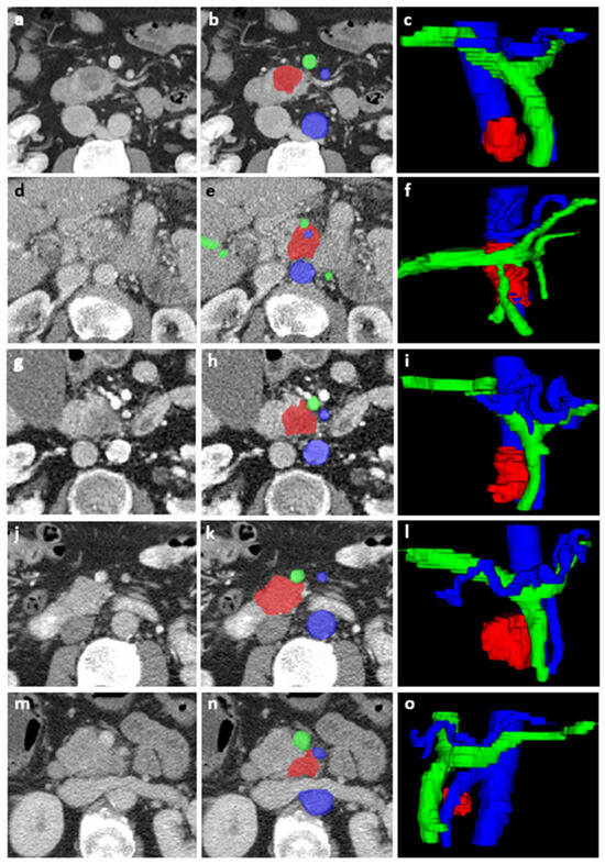 Segmentations of five example cases included in this study. For each case, an axial CECT slice (with and without segmentations) and a 3D view of the segmentation are shown (tumor in red, arteries in blue, and veins in green). First (a–c), a true positive case, without any vessel contact, where the three models and the MDT correctly predicted resectability. Second (d–f), a true negative case, with both arterial and venous tumor–vessel contact, where the three models and the MDT correctly predicted irresectability. Third (g–i), a false positive case, with venous tumor–vessel contact, where the three models and the MDT predicted resectability, but the tumor was irresectable during surgery due to encasement of the VMS. Fourth (j–l), a false negative case, with venous tumor–vessel contact, where the three models predicted irresectability, the MDT predicted resectability, and the tumor was resected. Finally, (m–o), a true negative case, with venous and arterial tumor–vessel contact, where the three models predicted irresectability and the MDT predicted resectability, but the tumor was irresectable during surgery due to the encasement of VMS and AMS.
