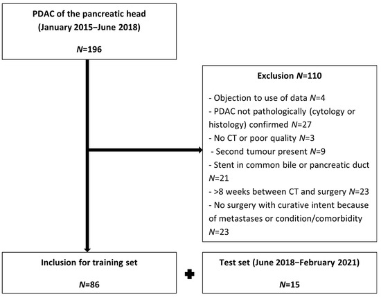 This retrospective study consecutively included patients diagnosed between January 2015 and June 2018 with proven PDAC of the pancreatic head (cytology or histology). The majority of patients were referred to our tertiary pancreatic cancer center, and all patients were chemo-naïve. We excluded patients for whom surgery with curative intent was not possible due to metastases or a poor performance status, patients with a stent or endoprosthesis in the pancreatic or common bile duct present on CECT, patients to whom neoadjuvant treatment had been administered, and patients for whom the interval between CECT and surgery (if applicable) was more than eight weeks. We validated the model results in a test set of 15 patients diagnosed between June 2018 and February 2021 who met the same criteria. To obtain a balanced test set, cases were selected in the same ratio as the training set with regard to MDT classification and whether or not surgery was performed.