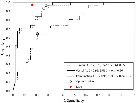 The least absolute shrinkage and selection operator (LASSO) [21] was used on the training set for additional feature selection, leading to three different feature sets: (1) tumor features, (2) vessel features, and (3) a combination of tumor and vessel features. The LASSO hyperparameter lambda was optimized using five-fold cross-validation. For each feature set, a support vector machine (SVM) classifier was trained on the full training set, using a linear kernel to keep the model complexity low. The box constraint hyperparameter was optimized using Bayesian optimization, with the MATLAB (The MathWorks Inc. version 9.10 (R2021a), Natick, Massachusetts, United States of America) classification learner toolbox. Receiver operating characteristic (ROC) curves with the area under the curve (AUC) were created for the three models. The ROC curves of the three models were compared using the method established by Hanley and McNeil [22]. The performance of the three SVM classifier models for the training set was determined by calculating the sensitivity, specificity, positive predictive value (PPV), and negative predictive value (NPV) at the optimal point on the ROC curves according to the Youden index [23]. The results were validated by calculating the performance for the test set using crosstabs. The performance of the MDT was also calculated using crosstabs. Resectable and borderline resectable were combined to facilitate sensitivity and specificity analysis. The statistical significance of the differences in sensitivity and specificity between the models and the MDT were evaluated using the McNemar test.