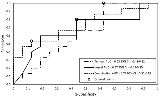 After feature selection including the LASSO method again, three models were created: the tumor feature model consists of four features, the vessel feature model consists of two features, and the combined features model consists of five features (four tumor, one vessel). Figure 6 shows the ROC curves with optimal points of the training set. The performance of the models at the optimal points (sensitivity, specificity, PPV, and NPV) is displayed in Table 4. There was no significant difference between the AUCs of the three models. The results of the three trained SVM classifiers were validated using the seven resected patients of the test set; these results are also displayed in Table 4.
