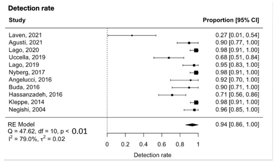 Forest plot for the detection rate [26,27,28,29,30,31,32,33,34,35,36].