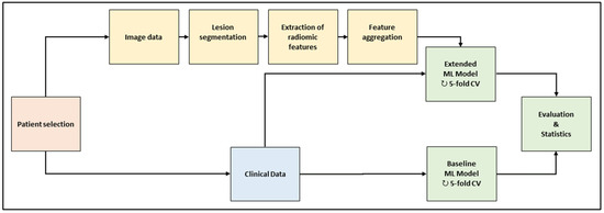 The workflow is depicted in Figure 1. In the baseline computed tomography (CT) images of the selected patient cohort, all metastatic lesion volumes were segmented by hand. A large set of radiomic features was extracted per lesion and aggregated across the lesions per patient. Two machine-learning (ML) models were trained and evaluated with a repeated five-fold cross-validation scheme. The baseline model used clinical data only; the extended model used clinical data and radiomic features. The models consisted of feature preprocessing, feature selection, training, and validation.
