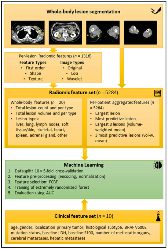 Schematic workflow of the radiomic analysis. Top yellow box: Examples of manual segmentations in axial reformatted CT slices in portal venous contrast medium phase. Second yellow box from top: radiomic features extracted per lesion. Third yellow box from top: Radiomic features aggregated per patient. Green box: machine-learning process. Bottom yellow box: Clinical feature set. Abbreviations: AUC (area under the curve), BRAF (v-Raf murine sarcoma viral oncogene homolog B1), FCBF (fast correlation-based filter), LDH (lactate dehydrogenase), LoG (Laplacian of Gaussian).