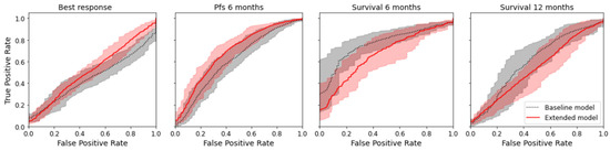 The radiomics model was numerically superior to the baseline model for the prediction of best response and PFS for six months (delta of the mean AUC for best response +0.064; delta for PFS +0.093) but not for the prediction of overall survival at six and twelve months (delta for overall survival after six months −0.094; delta for overall survival after twelve months −0.078); see Table 2. However, the difference was not significant, as there was an overlap of the confidence interval for all endpoints. Figure 4 shows the mean ROC curve for all endpoints and both models, where an overlap of the CI of the ROC curves can also be seen. Except for the baseline model for best response, all models indicated a prediction capacity (mean AUC > 0.5); however, only three models were significantly superior to random guessing (AUC 0.5 not included in CI). See Table 2.
