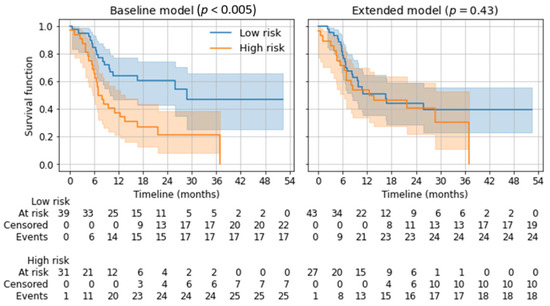 Depending on the twelve-month overall survival prediction in the five-fold cross-validation, applicable patients were divided into a low-risk and a high-risk group using Kaplan–Meier estimators. Subsequent log-rank tests showed a significant distinction for the baseline model (p < 0.005) but not for the extended model (p = 0.43). See Figure 5.