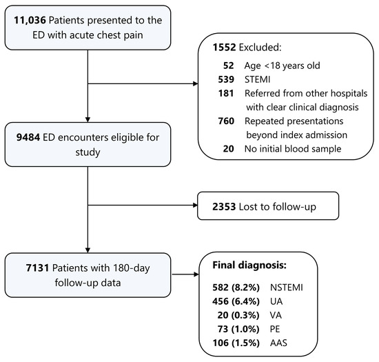 Summary of enrollment, exclusions, and diagnosis, and follow-up. ED, emergency department; STEMI, ST-elevation myocardial infarction; NSTEMI, non-ST-elevation myocardial infarction; UA, unstable angina; VA, variant angina; PE, pulmonary embolism; AAS, acute aortic syndrome.