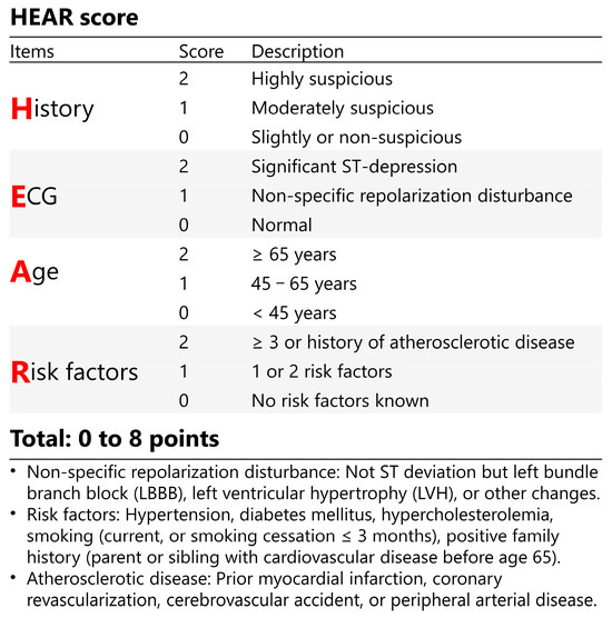 - Moumneh, T.; Sun, B.C.; Baecker, A.; Park, S.; Redberg, R.; Ferencik, M.; Lee, M.-S.; Douillet, D.; Roy, P.-M.; Sharp, A.L. Identifying Patients with Low Risk of Acute Coronary Syndrome Without Troponin Testing: Validation of the HEAR Score. Am. J. Med. 2020, 134, 499–506.e2. [Google Scholar] [CrossRef]
