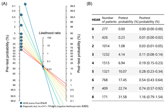 Fagan’s nomogram for patients with suspected NSTEMI. To use the nomogram, draw a straight line from the pre-test probability for the patient (left-hand side) through the likelihood ratio for the patient’s test result (middle) to arrive at the estimated post-test probability of disease (right-hand side). To derive the pathway, pretest probability was calculated based on HEAR score and 0 h hs-cTnT was used as the diagnostic test. Since the negative likelihood ratio (NLR) of 0 h hs-cTnT < 14 ng/L was calculated to be 0.025 in the current cohort, (A) Fagan’s nomogram with a NLR of 0.025 and (B) the corresponding probability conversion are shown in the figure.