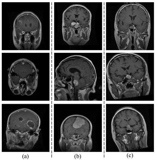 Initially, the dataset consisted of 3064 T1-weighted, contrast-enhanced images derived from 233 patients who presented with three distinct types of brain tumors: meningioma (comprising 708 slices), glioma (comprising 1426 slices), and pituitary tumors (comprising 930 slices) [40]. Obuli [41] meticulously compiled this dataset, ensuring that each category contained 5000 images. Figure 1 displays sample images representing three distinct brain tumor types—(a) glioma, (b) meningioma, and (c) pituitary tumor—which were obtained from the dataset compiled by Obuli [41].