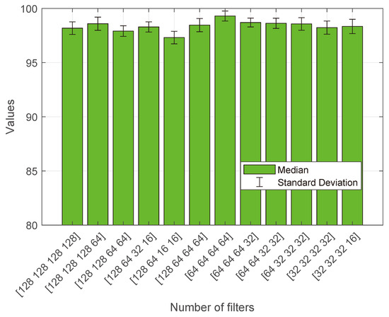 Figure 2 depicts an analysis of ESRNet’s performance in terms of accuracy based on varying numbers of filters. The experiment involved different filter configurations, such as ‘[128 128 128 128]’, ‘[128 128 128 64]’, and others. The results highlight that ESRNet attained exceptional performance, particularly when utilizing filters with the configuration ‘[64 64 64 64]’. This configuration yielded a remarkable accuracy of , showcasing the efficacy of this specific filter arrangement in optimizing model performance.
