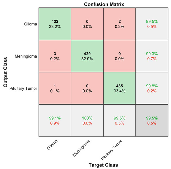 where represents the loss function, N is the number of training samples, C is the number of classes (in our case, 3 for meningioma, glioma, and pituitary tumor), denotes the true class label for the ith sample, represents the predicted probability of the ith sample belonging to class j, and is an indicator function that equals 1 when is equal to j, and 0 otherwise.