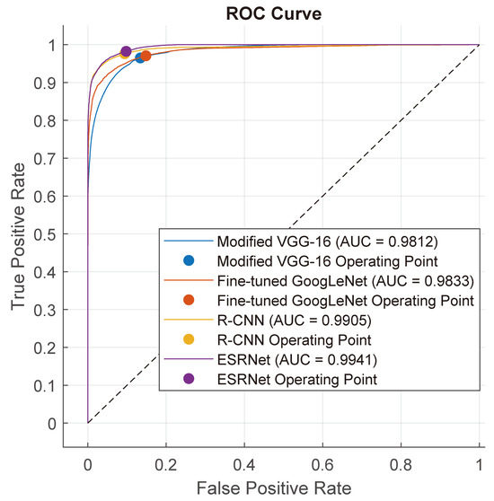 Figure 5 presents a ROC analysis of modified VGG-16, R-CNN, fine-tuned GoogLeNet, and the proposed ESRNet. It showcases the balance between the false positive rate (FPR) and the true positive rate (TPR) for each model. It demonstrates that the proposed ESRNet achieves significantly superior performance in terms of ROC, indicating its effectiveness in distinguishing between positive and negative cases. Importantly, the comment underscores the noteworthy achievement of the proposed ESRNet model, showcasing remarkable results with an area-under-the-curve (AUC) value of 0.9941.