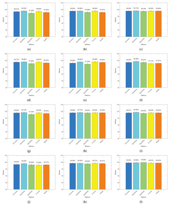 Figure 6 presents a comparative analysis of the median values for each model, including (a) CNN [15], (b) multi-scale CNN [16], (c) ResNet-18 [30], (d) CNN and RCNN [31], (e) VAE and GAN [18], (f) EfficientNets [19], (g) BTC-fCNN [28], (h) InceptionResNetV2 [29], (i) modified VGG-16 [27], (j) R-CNN [20], (k) fine-tuned GoogLeNet [17], and (l) the proposed ESRNet. These models were evaluated across five essential metrics: accuracy, sensitivity, specificity, F-score, and Kappa, which are represented by a distinct bar color, i.e., blue, cyan, green, yellow, and orange, respectively. The median values were computed based on 30 separate evaluations for each model. Additionally, red bars representing the standard deviation () values are provided to illustrate the degree of performance variation among these models. Overall, DSRNet demonstrated superior performance compared to the competitive models, consistently achieving significantly higher results.