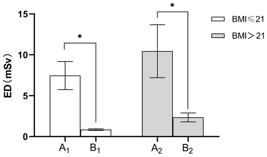 Comparison of average ED values in various groups. A1 = SDCT group (BMI ≤ 21 kg/m2); B1 = LDCT group (BMI ≤ 21 kg/m2); A2 = SDCT group (BMI > 21 kg/m2); B2 = LDCT group (BMI > 21 kg/m2). The effective dose (ED) decreased by an average of 89.42% (for BMI ≤ 21 kg/m2), 77.68% (for BMI > 21 kg/m2), respectively, under the LDCT protocol compared to the SDCT protocol. * indicates p < 0.05, Bonferroni corrected.