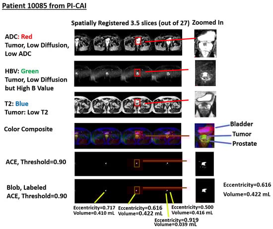 Figure 2 shows an example of a stitched spatially registered image. Figure 2 shows three spatially registered sequences (ADC, HBV, and T2) and a color composite generated by assigning red, green, and blue to the ADC, HBV, and T2 sequences, respectively. Spatially registered “cubes” were “stitched” together and abutted together in the horizontal direction and are also shown in Figure 2. A shared zoomed-in part of the image is shown for the ADC, HBV, T2, and composite color image. The tumor in this color scheme appears green (low ADC, High B Value HBV, and low T2). Also, Figure 2 shows the voxels that exceed the threshold = 0.90 for ACE along with displays of the blobbing and labeling [12] of voxels exceeding the ACE threshold = 0.90. The computed eccentricities and volumes are listed for every blob.