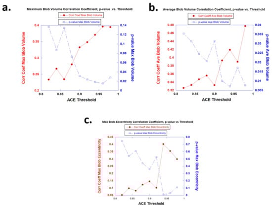 Figure 3 shows plots of correlation coefficients (R) (red) and p-values (blue) from the linear regression fitting of the maximum blob volume, average blob volume, and maximum blob eccentricity for Figure 3a–c, respectively, to the ISUP grade for 42 patients as a function of the ACE thresholds. A higher (lower) correlation coefficient (p-value) corresponds to high ACE thresholds (>0.90). The correlation coefficients (p-values) generally monotonically increase (decrease) as a function of the ACE threshold. Sufficiently low p-values (<0.05) are only observed for the ACE threshold (0.90).