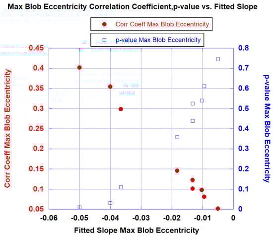 Figure 4 plots the correlation coefficients (red) and p-values (blue) against the fitted slopes from fitting the maximum blob eccentricity to the ISUP grade. The steeper the slope, the higher (lower) the correlation coefficient (p-value) and further confirming that maximum blob eccentricity is negatively correlated with tumor aggressiveness.