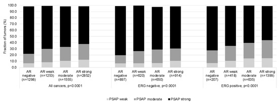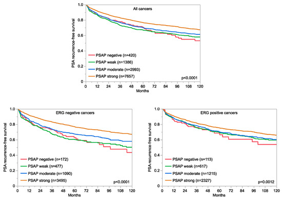 Prognostic information was available for 12,457 (80.6%) of the 15,455 successfully analyzed prostate cancers. In these tumors, PSAP staining was absent in 3.4%, weak in 11.1%, moderate in 24.1%, and strong in 61.4% of cases. A low level of PSAP staining was significantly linked to a high Gleason score (p < 0.0001), advanced pT stage (p < 0.0001), nodal metastasis (p < 0.0001), high preoperative PSA values (p < 0.0001), and early PSA recurrence (Table 2 and Figure 3 p < 0.0001). Because a low level of PSAP immunostaining was strongly linked to TMPRSS2:ERG fusion, as detected by IHC and FISH (p < 0.0001 each; Supplementary Figure S2), associations with tumor phenotype and prognosis were also separately analyzed in cohorts of ERG-negative and positive tumors (Supplementary Tables S2 and S3). These analyses showed that the link between reduced PSAP expression and unfavorable tumor features was mainly driven by ERG-negative tumors. In addition, the association with PSA recurrence was stronger in ERG-negative (Figure 3; p < 0.0001) than in ERG-positive cancers (p = 0.0012; Figure 3). A low level of PSAP immunostaining was also associated with high androgen receptor levels in both ERG-negative (p < 0.0001) and ERG-positive cancers (p < 0.0001, Figure 4).