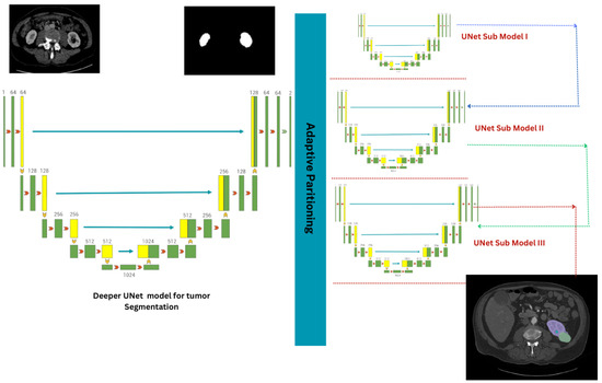 In this study, we have introduced an innovative methodology that leverages adaptive partitioning and weight pruning to enhance the efficiency and accuracy of the UNet model [26] for kidney tumor segmentation. Our extensive evaluation, conducted on the KiTs19, KiTs21, and KiTs23 variant datasets [23,25], illustrates the efficacy of our approach in addressing the challenges inherent to medical image analysis. By incorporating adaptive partitioning, we have optimized the model’s architecture by breaking it down into submodels, each tailored explicitly for reduced complexity and efficient parallel processing. This partitioning strategy, coupled with weight pruning, not only streamlined the computational workload but also significantly improved overall inference speed.