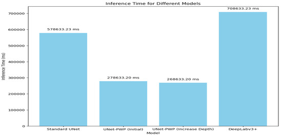 When it comes to medical image segmentation, it is not just about accuracy and complexity—real-time inference speed is also important. To test our proposed models, we analyzed their inference times on the same hardware platform. As shown in Figure 6, our UNet with adaptive Partitions + Weight Pruning (Proposed Model) performed significantly better than the Standard UNet [26] and DeepLab V3+. This improvement is achieved with the adaptive partitioning and weight-pruning techniques we used, which optimize processing load and improve model responsiveness during inference.