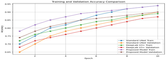 In addition, Figure 7 displays a visual analysis of the training and validation accuracy for three different models: the Standard UNet [26], DeepLab V3+, and the Proposed Model. This graphic shows how the accuracy changes over multiple training epochs, giving insight into the learning progress of each model.