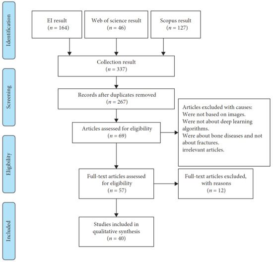 Among a large number of papers, this review selected 40 papers for analysis based on these criteria. All these papers focus on deep learning algorithms applied to X-ray bone images. Furthermore, they had to meet the requirements of being published within the past five years, showcasing state-of-the-art approaches, proving their effectiveness, and representing the field well. To summarize various research studies, this review separated these papers into four modeling tasks, which are recognition, classification, detection, and localization.