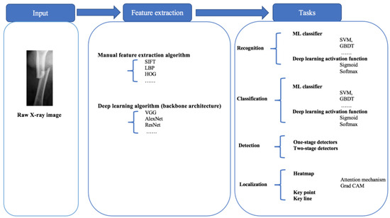 Image processing algorithms usually have two main steps as illustrated in Figure 2. The first step is feature extraction and the second step is the specific modeling task, such as recognition, classification, detection, and localization. Feature extraction usually has two methods, i.e., manual feature extraction and deep learning algorithms. Bone fracture diagnosis research needs to draw lessons from the state-of-the-art in deep learning [22] because the application of deep learning algorithms always lags behind theory research. In deep learning algorithms, feature extraction is carried out on backbone architecture, which is the most basic part of deep learning algorithms [26]. Once the features have been extracted, only the specific modeling tasks will be performed, such as classification, detection, etc. Both machine learning classifiers and deep learning models play a key role in solving the specific problem after extracting features. The process of these four tasks will be reviewed in detail in this paper.