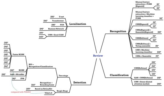 A clearer definition of the modeling tasks has been refined based on the content of the bone fracture diagnosis and mainstream terminology rule of the computer vision domain from the papers [24,25,28,29,30,31,32,33,34,35,36,37,38,39,40,41,42,43,44,45,46,47,48,49,50,51,52,53,54,55,56,57,58,59,60,61,62,63,64,65,66]. The modeling task includes recognition, classification, detection, and localization.