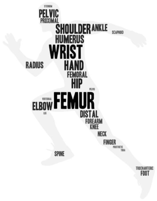 Almost all the studies have their own focus on a certain bone part, such as the femur, wrist, shoulder, hip, hand, humerus, elbow, pelvis, ankle, etc. The pool of research on the different types of bones in the human body can be seen in the word cloud diagram in Figure 4. The most popular bone part included in this review paper is the femur, followed by the wrist, and the rest, following the font size in a decreasing manner. As different types of bone have different features, focusing on training and learning on one type of bone has a better performance for algorithms. However, researchers nowadays are inclined to work on finding a more generic model that can work on different parts simultaneously, such as the femur, wrist, shoulder, etc., which detect fractures in the shoulder, wrist, and ankle [29,36,57,61]. The most widely used public radiographic image dataset is MURA, which has 9045 healthy and 5818 unhealthy musculoskeletal X-ray images [29]. These images include the hand, humerus, finger, wrist, elbow, shoulder, and forearm. However, most papers collected datasets from hospitals, such as Chang Gung Memorial Hospital [63], Xi’an Honghui Hospital [58], Seoul National University Bundang Hospital [40], etc. The quantitative range of these datasets is usually from 100 to 100,000.