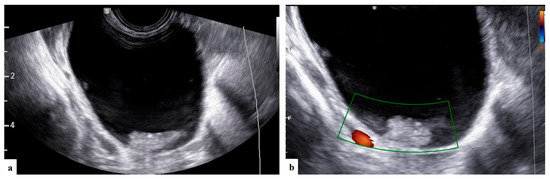 Ovarian cysts identified in the early stages of pregnancy are ovarian endometriomas in about 4–5% of cases, while most adnexal cysts identified after 16 weeks of gestation are mature cystic teratomas. Decidualized endometriomas usually show large intraluminal papillary projections with increased blood flow that resemble malignant ovarian tumors. Papillary projections can make it difficult to distinguish between benign masses like decidualized endometriomas and cystadenofibromas and malignant ones like invasive and borderline tumors [7,8,9,10].