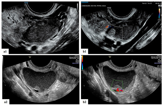 Grayscale (a1,a2) and color Doppler (b1,b2) ultrasound images of two decidualized endometriomas in our series (ongoing patients): moderately vascularized internal cyst wall, rounded papillary projections with smooth contours and cyst content with ground-glass echogenicity.
