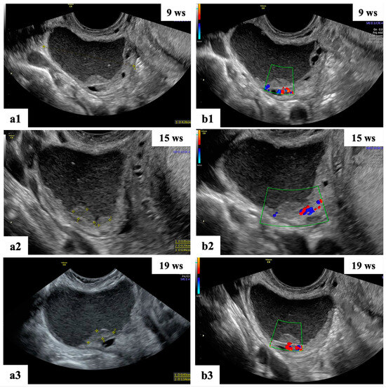 Ultrasound follow-up of the ongoing patient: grayscale (a1–a3,b1) ultrasound images showing unilocular mass with “ground glass” content suspected of decidualized endometrioma. The mass shows papillary projections with regular smooth contours and moderate vascularization at 15 wks (a2,b2) of gestation and reductions in the cyst dimension and number of papillary projections at 19 wks (a3,b3).