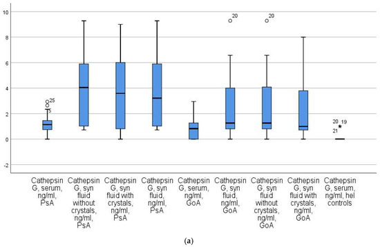 The serum CatG levels in both the PsA patients and the GoA patients did not exhibit a normal distribution within all groups (p ≤ 0.001 for all six Shapiro–Wilk tests). Before comparing the groups based on the target parameters using the Kruskal–Wallis test, we conducted a multiple linear regression analysis to assess the influence of age and BMI as covariates, with the group as an independent variable. The analysis revealed that the effect of these covariates was not significant for CatG (age, p = 0.141; BMI, p = 0.891). Thus, age and BMI were determined not to have an impact on the CatG levels.