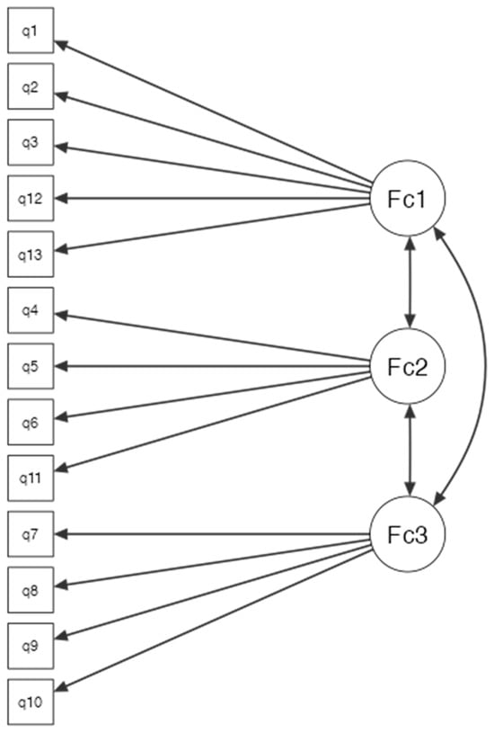 In the CFA, we used the results of the PCA. Namely, we investigated how well a CFA model fit the data in the three factors that the PCA suggested. Specifically, based on the PCA results for each factor, we only kept the items that had absolute (loading) > 0.4, so no question was excluded from the model. The analysis showed that our CFA model fit without any numerical issues. Figure 4 presents the path diagram of the estimated CFA model.