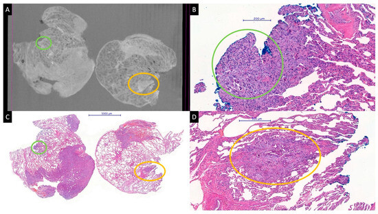 Micro-CT image from a paraffin block (A) and whole slide HE images (B–D) of a pulmonary adenocarcinoma. A satellite tumor nodule of about 1000 μm, very near to the blue-stained parenchymal resection margin, is perfectly visible in the micro-CT image (yellow circles). A smaller tumor nodule (green circles) at the margin is barely visible on the micro-CT image (A). The specimens were scanned with a high-resolution desktop micro-CT system (Bruker micro-CT Systems 1275, Kontich, Belgium). The scanning parameters used were 35 kVp, 231-mA, without filter, 16 µm pixel size, rotation at 0.2 steps with 360°. The mean time of scanning was around 30 min. NRecon (ver. 1.7.4, Bruker micro-CT Systems, Kontich, Belgium) software was used for the reconstruction. CTAn (v. 1.20.3 Bruker micro-CT Systems, Kontich, Belgium) software was used for the 3D image analysis. CTVox (v. 3.3.0 Bruker micro-CT Systems, Kontich, Belgium) was used for visualization of the samples for images.