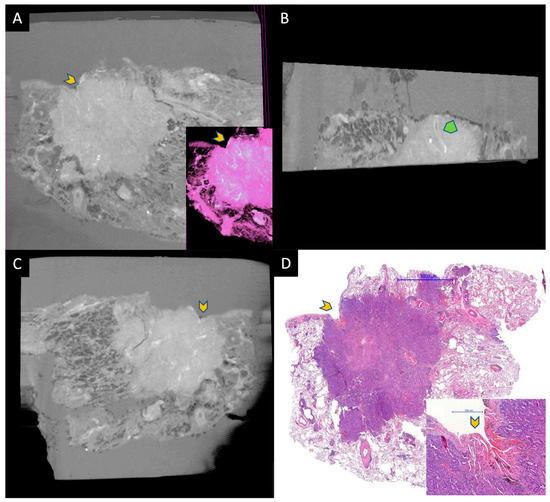 Although histopathology is a time-honored method and constitutes the gold standard for the examination of human tumors, both conventional glass slides and their relatively new alternative, digital whole slide images (WSIs) obtained by scanning the glass slides, provide only two-dimensional (2D) information on a tumor, which is in fact a three-dimensional (3D) entity [2,3]. Although 3D images can be reconstructed from serial WSIs, this is difficult and time-consuming, and it requires the whole paraffin block to be consumed, thereby disrupting the integrity of the tissue examined [4,5,6]. Additionally, in a histopathological examination, the amount of submitted tissue and the size of the tissue cassettes limit the material that is examined. Furthermore, bony and calcified tissues must be decalcified, and staples must be removed for sectioning to prepare the glass slides for microscopic examination.