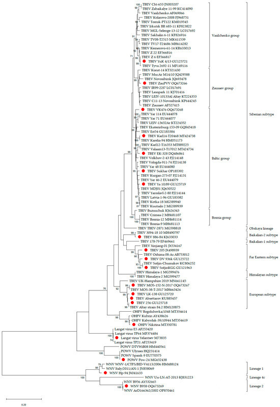 Phylogenetic tree of the Orthoflavivirus genus. Phylogenetic trees were constructed using protein E fragments (1097 bp) in MEGA X using the maximum likelihood method (1000 bootstrap replications). Bootstrap values (>70%) are shown at the branches. GenBank accession numbers are listed for each strain. Strains used in this work are marked with red circles.