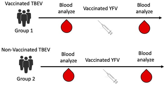 The fifth set of sera from TBEV-vaccinated and non-vaccinated patients before and after YFV vaccination was previously obtained in a clinical comparative study of YFV vaccines (protocol JLH-III-01/20). All participants in the comparative study gave voluntary, informed consent to the use of sera. Sera of people vaccinated with the SinSaVac vaccine (LLC “Smartbiotech”, Moscow, Russia) were used. The scheme for obtaining the sera is shown in Figure 2. Previously vaccinated study participants received the EnceVir vaccine (Microgen, Moscow, Russia). The presence of anti-TBEV antibodies in the sera of vaccinated people was confirmed using an ELISA VectoTBE-IgG kit (Vector-Best, Novosibirsk, Russia).